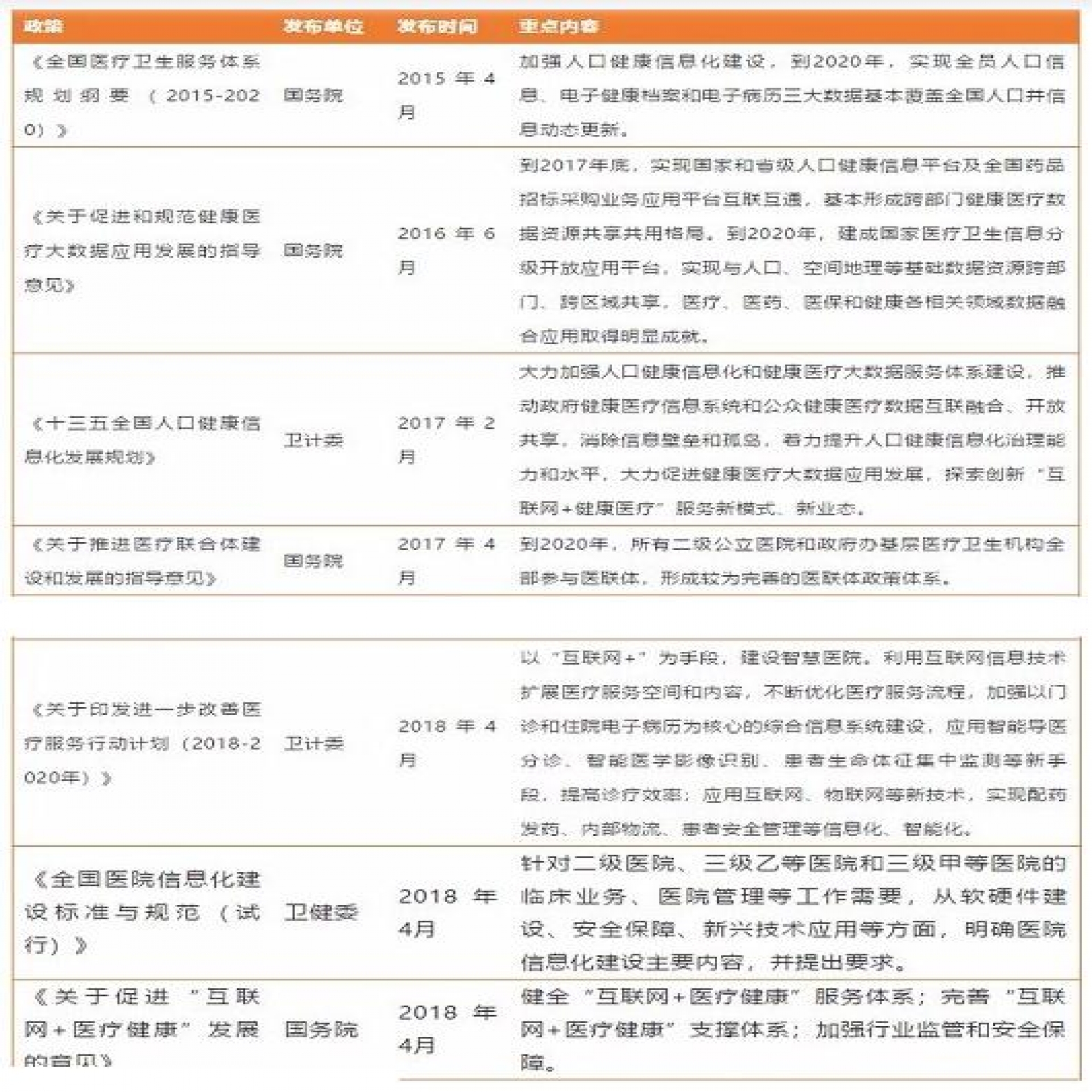 事實上,自2015年4月,國務院發(fā)布《全國醫(yī)療衛(wèi)生服務體系規(guī)劃綱要(2015-2020)》,提出加強人口健康信息化建設,到2020年,實現(xiàn)全員人口信息、電子健康檔案和電子病歷三大數(shù)據(jù)基本覆蓋全國人口并信息動態(tài)更新,我國陸續(xù)出臺了一系列加速醫(yī)療信息化產(chǎn)業(yè)發(fā)展的政策。
