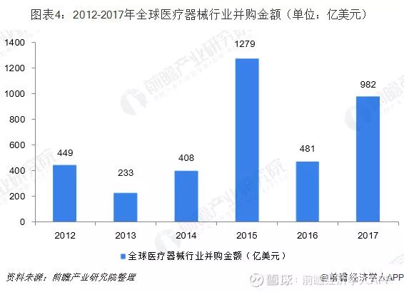 根據(jù)EvaluateMedTech數(shù)據(jù),2017年,全球醫(yī)療器械行業(yè)并購(gòu)規(guī)模為982億美元,較上年大幅增長(zhǎng)。