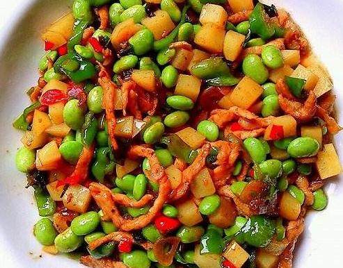 制作:將松子入鍋上火炒香備用。毛豆用滾水燙熟后再經(jīng)冷水沖洗,瀝水備用。香干切成小丁,胡蘿卜切成碎未,枸杞子沖洗干凈備用。色拉油入鍋,油熱后爆姜末出香味,再倒入香干、枸杞子調(diào)味,煸炒少許時(shí)間,傾入毛豆,拌炒均勻,放入調(diào)料和適量高湯。收湯后,灑上松子拌勻,出鍋。淋上麻油,盛入盤(pán)中放上裝飾菜即成。