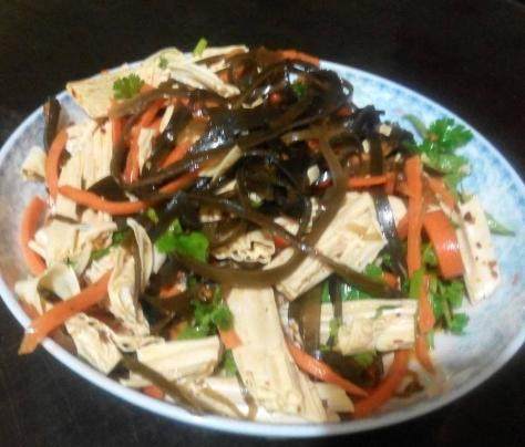 制作:腐竹切寸長(zhǎng)絲,入開(kāi)水中焯透,撈出過(guò)涼,瀝凈水。海帶、胡蘿卜、黃瓜洗凈后,均切寸長(zhǎng)細(xì)絲,熟瘦肉切絲,香蔥、蒜瓣各適量,切末。將各種絲料配備碼好入盤(pán)內(nèi),灑上香蔥末,上桌時(shí)加入全部調(diào)料,拌勻即食。