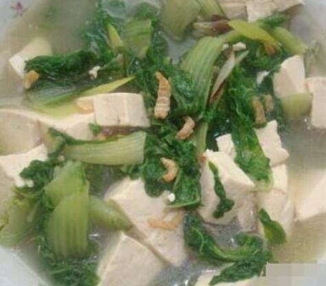 原料:豆腐750克,油菜125克,海米30克,植物油75克,麻油10克,味精7.5克,鹽8克,水淀粉20克,蔥花10克。