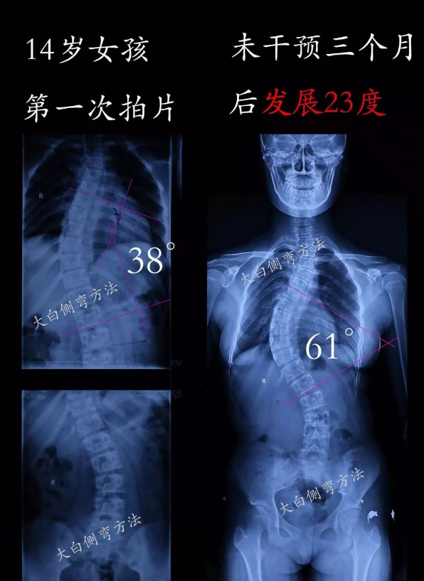 我們看到很多脊柱側(cè)彎發(fā)展的情況,例如:7天發(fā)展5度,3個(gè)月發(fā)展23度,5個(gè)月發(fā)展15度,3個(gè)月發(fā)展5度等。
