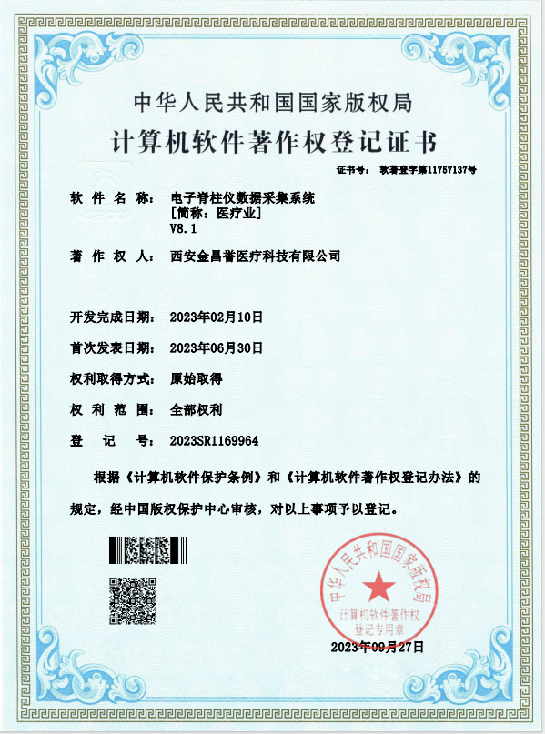 熱烈祝賀金昌譽(yù)“電子脊柱儀采集系統(tǒng)”登記成功